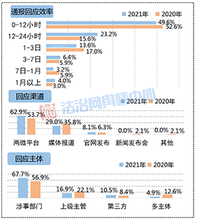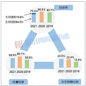從回應(yīng)主體來看,與2020年相比,由涉事部門進(jìn)行回應(yīng)的事件數(shù)量占比有所增加,達(dá)到62.9%,表明涉事主體主動作為的積極性有所提升;而上級主管部門介入回應(yīng)的比重下降了近7個百分點,側(cè)面反映出涉事部門輿情應(yīng)對能力在逐步精進(jìn),能夠較為及時遏制輿情擴(kuò)散和波及的范圍,一定程度上減輕了級主管部門的應(yīng)對壓力。同時,第三方回應(yīng)的事件數(shù)量比重也略微提升了約2個百分點,顯示出不少輿情事件呈現(xiàn)復(fù)雜化特征,牽涉主體逐漸多元化并且覆蓋多個領(lǐng)域系統(tǒng),這對部門間的協(xié)調(diào)銜接工作也提出了更高的要求。此外政法機(jī)關(guān)內(nèi)部多主體回應(yīng)的情況稍有減弱,相關(guān)案例所占比重較2020年減少了一半以上,為4.9%。