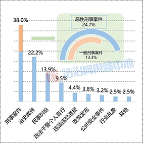 涉法輿情事件158起,占比95.2%。由刑事案件引發(fā)的輿情占比最高,達(dá)38.0%,其中惡性刑事案件占比24.7%,一般刑事案件占比13.3%。治安案件、民事糾紛、違紀(jì)違法通報引發(fā)的輿情分別占比22.2%、13.9%、4.4%。民事糾紛中,涉及婚姻問題尤其離婚的案事件同比較多,如福建連城縣法院發(fā)出首張“離婚冷靜期通知書”、湖南女子5年4次起訴離婚均被駁回、全國首例家庭勞務(wù)補(bǔ)償案宣判等。政策發(fā)布、公共安全事件引發(fā)的輿情分別占比3.8%、3.2%。此外,教育等行業(yè)亂象波及政法機(jī)關(guān)的輿情占比2.5%,其他輿情事件占比2.5%。