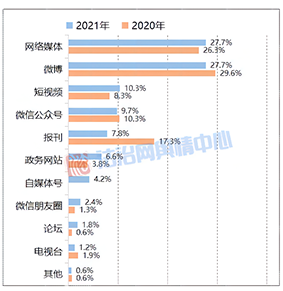 2021年,網(wǎng)絡(luò)媒體與微博仍為政法輿情最主要的“策源地”,自兩平臺初步曝光進(jìn)而發(fā)酵的輿情事件數(shù)量占比超55%。發(fā)酵于短視頻平臺的政法輿情占比自2019年以來出現(xiàn)“兩連漲”,僅次于網(wǎng)絡(luò)媒體和微博。相比之下,源自報刊、電視臺等傳統(tǒng)媒體的輿情占比持續(xù)減少,尤其是源于報刊的輿情大幅減少,數(shù)量占比自上一年度的17.3%銳減為7.8%。