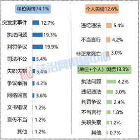 從輿情類型來看,責(zé)任主體分為三個層面:涉及政法單位的輿情占比74.1%,涉及政法干警個人的輿情占比12.7%,涉及單位和個人的復(fù)合輿情占比13.3%。