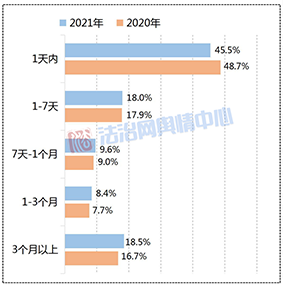從輿情爆發(fā)時長來看,2021年與2020年的整體差別不大,從事發(fā)到輿情發(fā)酵的所用時間依舊偏短,主要爆發(fā)時長都集中在7天以內(nèi),占比累計超六成,其中1天內(nèi)爆發(fā)的輿情事件比重遠(yuǎn)高于其他時長的,達(dá)到45.5%。由此可見,在以移動社交媒體為主要傳播途徑的時代,信息傳播速度不斷提升,輿論節(jié)奏也被持續(xù)壓縮。例如在網(wǎng)民“辣筆小球”侮辱戍邊英烈一案中,其違法言論一經(jīng)發(fā)布便遭到網(wǎng)民譴責(zé),事發(fā)后不到12小時,個人微博被禁言,當(dāng)天新華社、《人民日報》等央媒對此事發(fā)表評論,次日當(dāng)?shù)鼐骄蛯ο右扇瞬扇⌒淌聫?qiáng)制措施并進(jìn)行通報,事件從發(fā)酵到處置僅用一天左右的時間,進(jìn)展速度很快。此外,與2020年相比,2021年中輿情發(fā)酵與事發(fā)間隔1至3年的事件占比翻番,達(dá)到7.2%,如北京“教授狀告知網(wǎng)侵權(quán)案”在獲得新進(jìn)展之后再度引發(fā)關(guān)注,說明無論案件是否已經(jīng)閉環(huán),只要爭議尚存,輿情就仍有復(fù)燃的風(fēng)險。