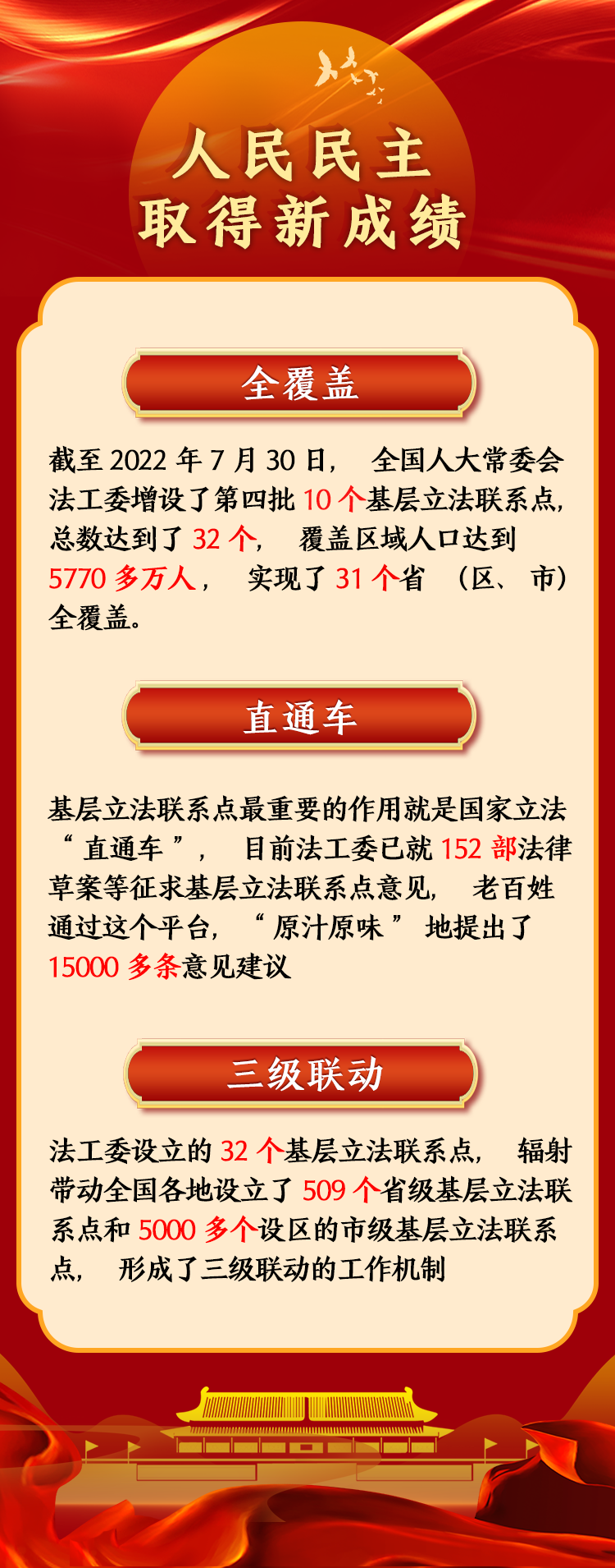 2022年,全國人大常委會加強(qiáng)人民當(dāng)家作主制度保障,將全過程人民民主重大理念上升為新修改的地方組織法等國家基本法律制度,擴(kuò)大人民有序政治參與和立法參與,保證人民依法行使民主權(quán)利,發(fā)展全過程人民民主取得了新成績。