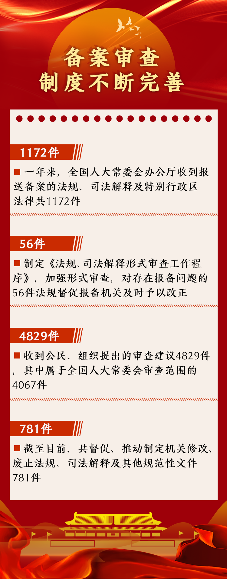 數(shù)字顯示,一年來,全國人大常委會辦公廳收到報送備案的法規(guī)、司法解釋及特別行政區(qū)法律共1172件。制定《法規(guī)、司法解釋形式審查工作程序》,加強(qiáng)形式審查,對存在報備問題的56件法規(guī)督促報備機(jī)關(guān)及時予以改正。收到公民、組織提出的審查建議4829件,其中屬于全國人大常委會審查范圍的4067件。