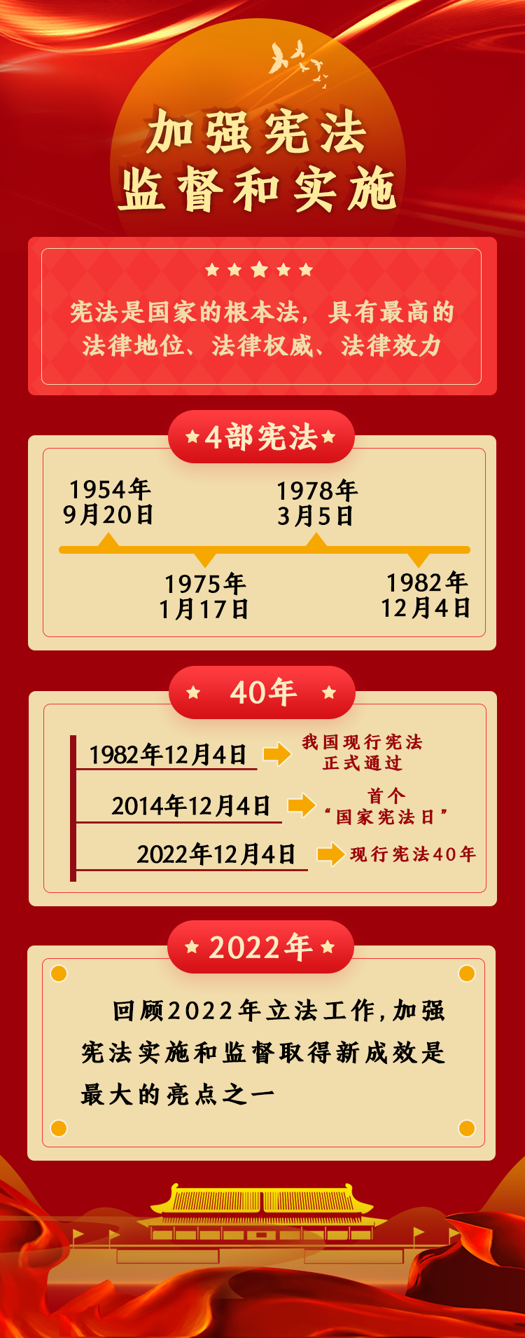 2022年是我國現(xiàn)行憲法公布施行40周年。這40年,也是我國改革開放深入推進(jìn)、經(jīng)濟(jì)社會迅速發(fā)展、人民生活水平不斷提高的40年?;仡?022年立法工作,加強(qiáng)憲法實施和監(jiān)督取得新成效是最大的亮點之一。具體包括,不斷健全保證憲法全面實施的制度體系,通過完備的法律保證憲法實施,嚴(yán)格落實合憲性審查制度機(jī)制,深入推進(jìn)合憲性審查工作,更好發(fā)揮憲法在治國理政中的重要作用,維護(hù)憲法權(quán)威和尊嚴(yán)。