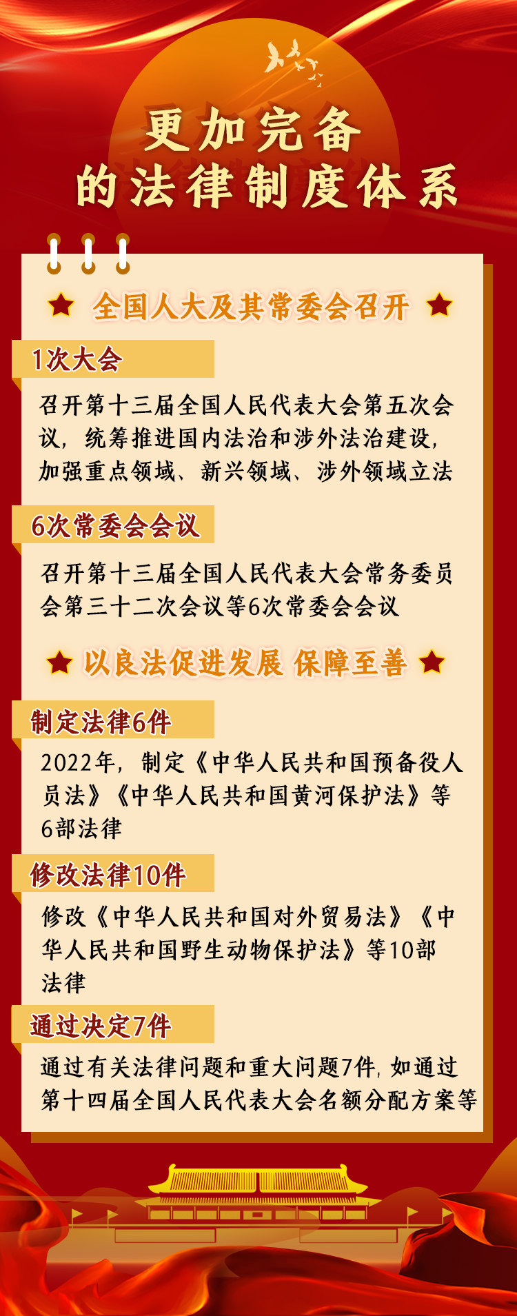 據(jù)統(tǒng)計,2022年,全國人大及其常委會召開了1次大會和6次常委會會議,統(tǒng)籌推進(jìn)國內(nèi)法治和涉外法治建設(shè),加強(qiáng)重點領(lǐng)域、新興領(lǐng)域、涉外領(lǐng)域立法,制定法律6件,修改法律10件次,作出法律解釋1件,通過有關(guān)法律問題和重大問題決定7件,法律制度體系更加完備。