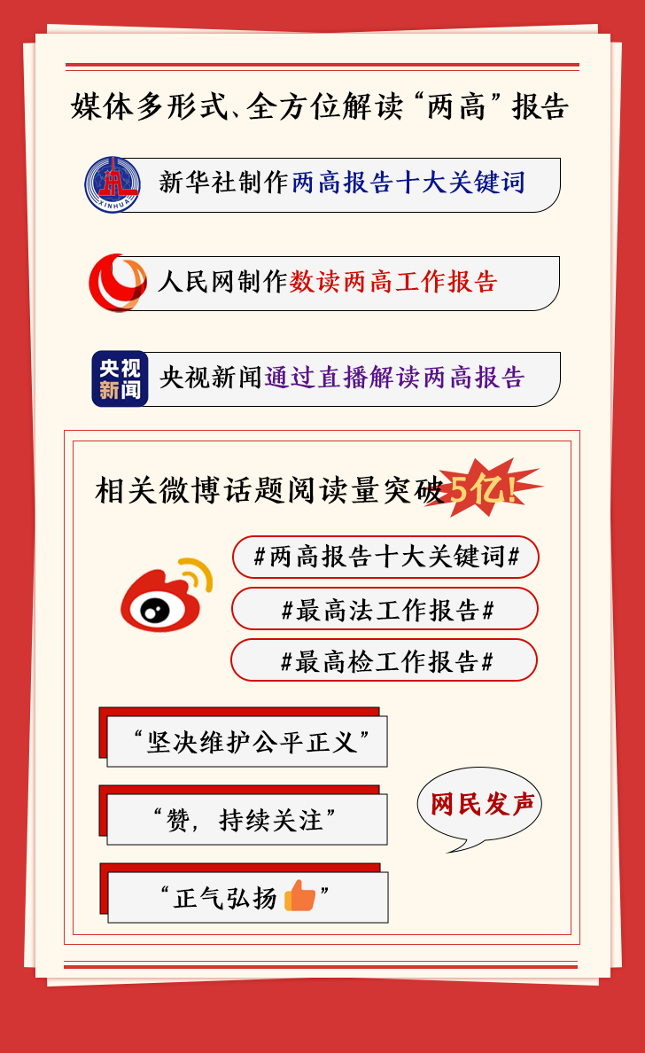 新華社制作長(zhǎng)圖整理“兩高”報(bào)告亮點(diǎn)內(nèi)容;人民網(wǎng)用數(shù)據(jù)解讀“兩高”報(bào)告;“@央視新聞”則通過(guò)直播幫助公眾快速了解報(bào)告詮釋的法治精神?!皟筛摺眻?bào)告相關(guān)話題獲得網(wǎng)民廣泛關(guān)注,截至3月8日8時(shí),“#兩高報(bào)告十大關(guān)鍵詞#”等微博話題閱讀量累計(jì)超5億。
