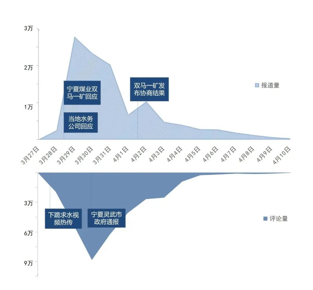 3月29日,部分中央主流媒體發(fā)聲表態(tài):“@中國新聞網(wǎng)”稱“‘缺水’的輿論場需要真相甘霖”;央廣網(wǎng)推出文章《萬畝治沙林被煤礦“斷水”?供水和調(diào)查必須馬上到位》,指出當(dāng)?shù)乇仨毐M快用客觀公正的調(diào)查還原真相,給林場主一個(gè)交代,給萬畝林場一個(gè)交代,也給公眾一個(gè)交代。輿論場還曝光一份判決書,顯示寧夏回族自治區(qū)銀川市中院曾作出判決,明確該煤礦占用林地,要求賠償孫國友727.54萬元。另據(jù)九派新聞報(bào)道,當(dāng)?shù)厮畡?wù)公司負(fù)責(zé)人稱,礦場污水處理達(dá)標(biāo),但是水的鹽分過高澆不了樹。煤礦一方稱,污水處理設(shè)備容量比較小,每天只能處理兩千立方,且資金成本太大,不想加大投入。靈武市政府相關(guān)人員向媒體表示,正在針對此事協(xié)調(diào)處理。當(dāng)日,“#萬畝樹木被煤礦斷水面臨枯死#”“#水務(wù)公司回應(yīng)萬畝林場主跪地求供水#”等相關(guān)微博話題沖上熱搜榜前列,輿情熱度達(dá)到峰值。部分網(wǎng)民表示,經(jīng)歷了沙塵暴,才能真正明白造林治沙的好處和難處,“不能讓好人流汗流淚又流血”。微博大V“@胡錫進(jìn)”也呼吁,希望不用下跪崩潰引起巨大輿情也能正常解決。