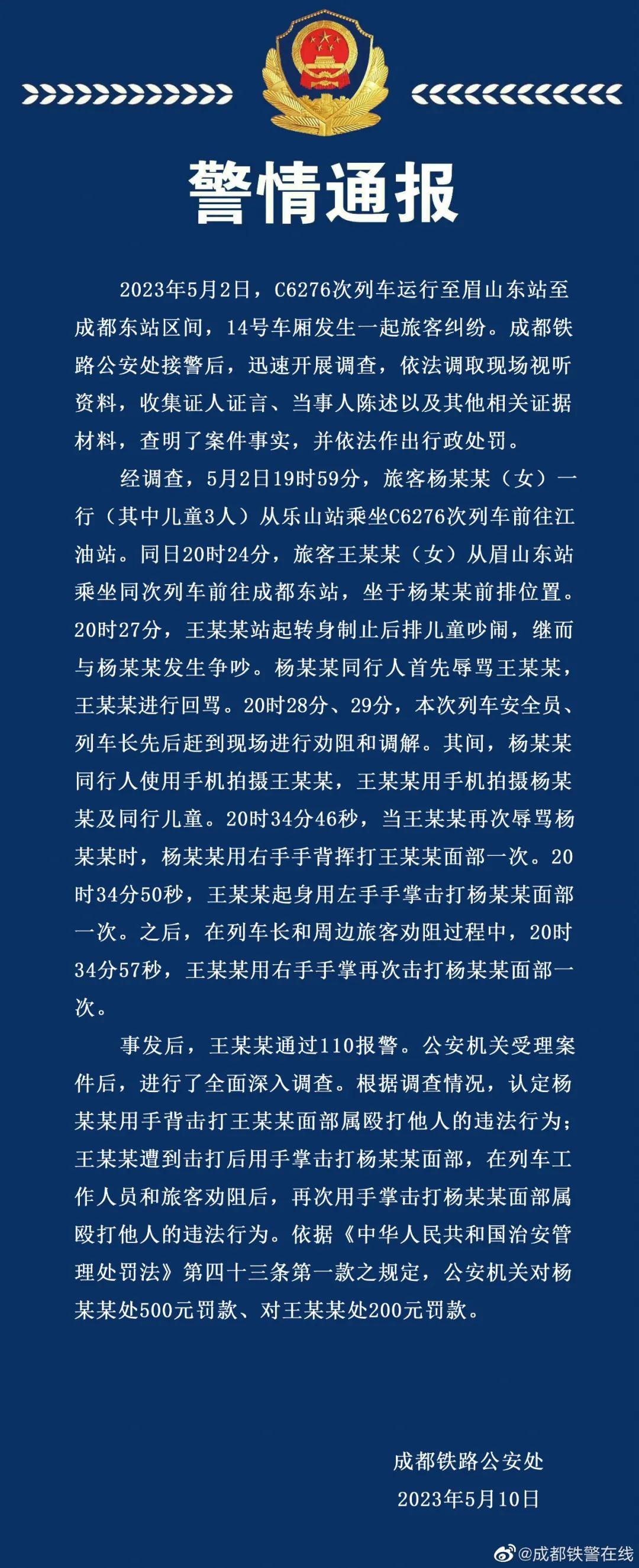 面對(duì)網(wǎng)絡(luò)質(zhì)疑,5月10日,成都鐵路公安處官方微博“@成都鐵警在線”發(fā)布警情通報(bào)稱,根據(jù)調(diào)查情況,認(rèn)定楊某某用手背擊打王某某面部屬毆打他人的違法行為;王某某遭到擊打后用手掌擊打楊某某面部,在列車工作人員和旅客勸阻后,再次用手掌擊打楊某某面部屬毆打他人的違法行為。警方據(jù)此認(rèn)為雙方均違反治安管理處罰法,并處以不同金額的罰款。隨后,四川廣播電視臺(tái)“@四川觀察”、封面新聞公布現(xiàn)場(chǎng)視頻,涉及列車車廂監(jiān)控、列車長(zhǎng)巡檢記錄儀、當(dāng)事雙方手機(jī)所拍視頻等多個(gè)角度,直觀地呈現(xiàn)雙方發(fā)生爭(zhēng)執(zhí)繼而爆發(fā)肢體沖突的過(guò)程。網(wǎng)絡(luò)討論熱度再次攀升,微博上形成“#高鐵掌摑事件雙方曾多次對(duì)罵#”“#高鐵被打女子2次打人被認(rèn)定違法#”“#王某某被打后兩次掌摑楊某某#”等多個(gè)話題,不少網(wǎng)民一改之前支持王某某的立場(chǎng)。但部分網(wǎng)民仍從情感角度出發(fā),質(zhì)疑官方對(duì)視頻進(jìn)行二次剪輯,認(rèn)為警方苛求被打者還擊的間隔時(shí)間有失公平。