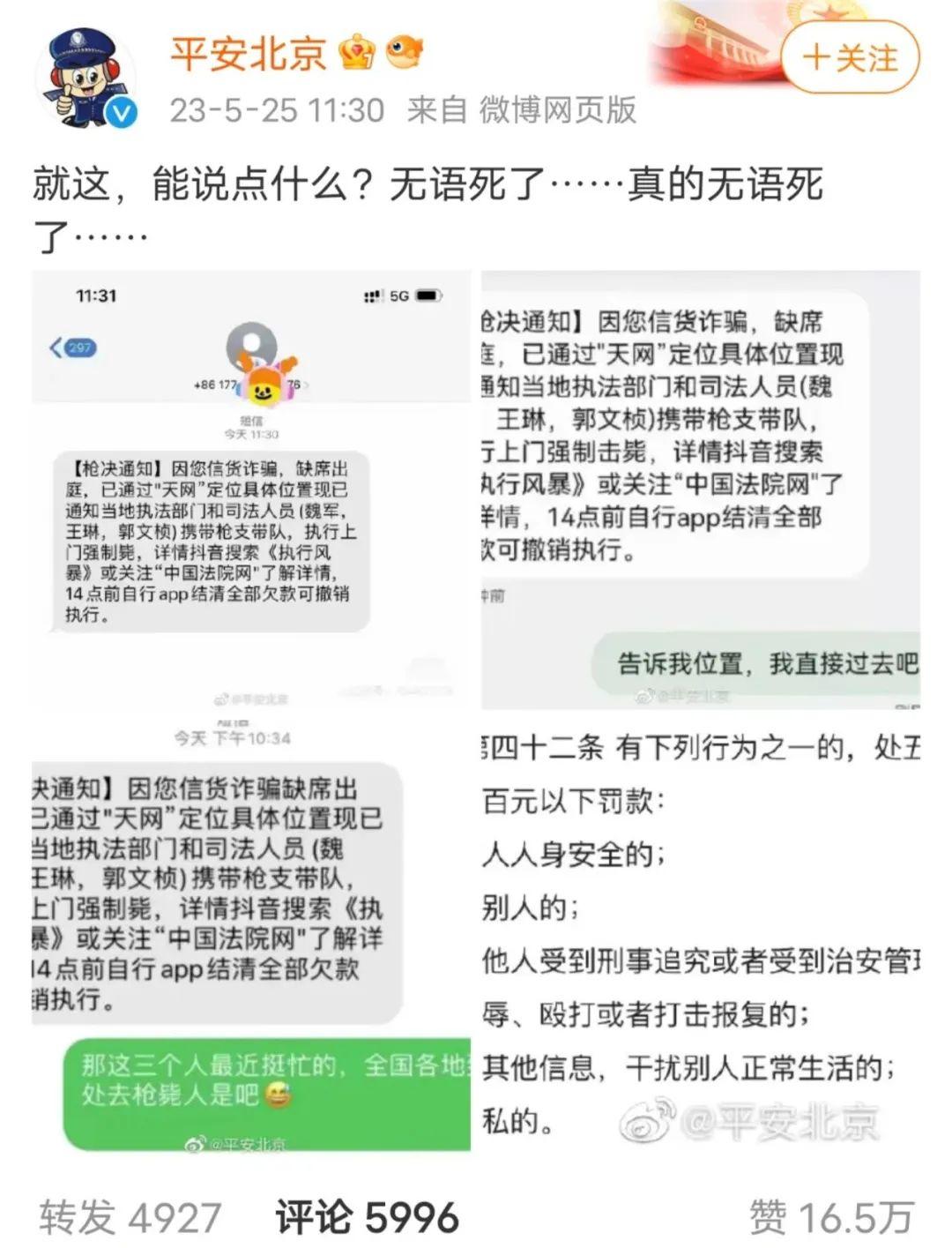 近日,多名網(wǎng)民曬出圖片稱收到“強(qiáng)制槍斃”詐騙短信,引發(fā)一小波關(guān)注。5月25日11時(shí)許,北京市公安局官方微博“@平安北京”發(fā)布一則為幾張?jiān)p騙短信截圖的微博,圖片內(nèi)容相同皆寫著:“因您信貸詐騙,缺席出庭,已通過(guò)‘天網(wǎng)’定位具體位置,現(xiàn)已通知當(dāng)?shù)貓?zhí)法部門和司法人員(魏軍,王琳,郭文禎)攜帶槍支帶隊(duì),執(zhí)行上門強(qiáng)制槍斃,詳情抖音搜索《執(zhí)行風(fēng)暴》或關(guān)注‘中國(guó)法院網(wǎng)’了解詳情,14點(diǎn)前自行app結(jié)清全部欠款可撤銷執(zhí)行?!睂?duì)此,“@平安北京”直言道“就這,能說(shuō)點(diǎn)什么?真的無(wú)語(yǔ)死了”。隨后,還配了治安管理處罰法的截圖,指出發(fā)短信恐嚇?biāo)怂媾R的處罰。該則微博迅速引發(fā)大量網(wǎng)民圍觀,相關(guān)微博轉(zhuǎn)評(píng)超過(guò)1.1萬(wàn)次,點(diǎn)贊16.5萬(wàn)次。多數(shù)網(wǎng)民表示騙子侮辱人智商,并留言調(diào)侃稱“笑死,現(xiàn)在槍決都能上門服務(wù)了”“這三個(gè)人挺忙,全國(guó)各地到處去槍斃人”。