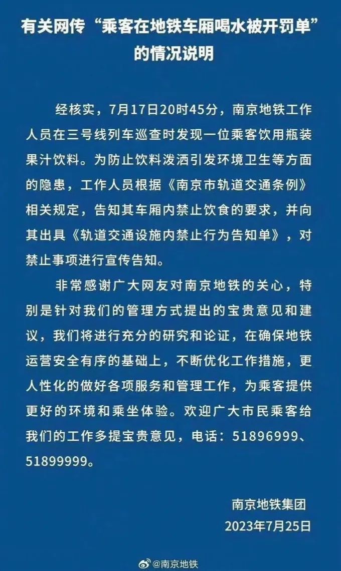 當日18時許,南京地鐵在其官方微博發(fā)布《有關網(wǎng)傳“乘客在地鐵車廂喝水被開罰單”的情況說明》,文中稱,工作人員在列車巡查時發(fā)現(xiàn)一位乘客飲用瓶裝果汁飲料,為防止飲料潑灑引發(fā)環(huán)境衛(wèi)生等方面的隱患,工作人員根據(jù)相關規(guī)定,向其出具《軌道交通設施內(nèi)禁止行為告知單》,對禁止事項進行宣傳告知。南京地鐵還表示,將“不斷優(yōu)化工作措施,更人性化地做好各項服務和管理工作”。