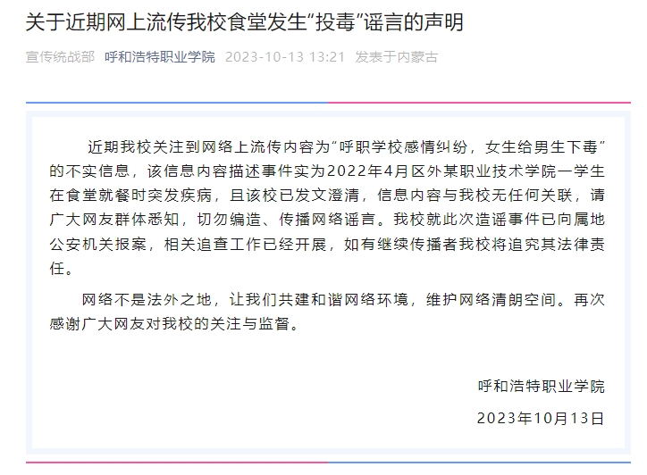 【典型案例】自10月初,連續(xù)有網(wǎng)民在社交媒體發(fā)視頻稱,呼和浩特職業(yè)學(xué)院發(fā)生悲劇,一名男生因感情糾紛被女生下毒致死,引發(fā)社會(huì)關(guān)注。10月13日,該校發(fā)布了一份聲明,澄清這條信息不實(shí),與學(xué)校無(wú)任何關(guān)聯(lián)。據(jù)悉,網(wǎng)絡(luò)流傳的視頻中描述的事件實(shí)為2022年4月江蘇南京交通職業(yè)技術(shù)學(xué)院一學(xué)生在食堂就餐時(shí)突發(fā)疾病 ,并非因?yàn)榕露?。而且,江蘇南京交通職業(yè)技術(shù)學(xué)院在當(dāng)時(shí)就已經(jīng)發(fā)布了相關(guān)澄清。再如,10月18日,網(wǎng)傳江蘇南京有男子在酒吧外性侵一名醉酒女子。當(dāng)日,事發(fā)地所屬南京市警方相關(guān)工作人員回應(yīng)稱,警方已查清此事,沒(méi)有性侵,網(wǎng)傳情況有夸大成分。另?yè)?jù)警方透露,某社交網(wǎng)站流傳的不實(shí)消息,“是專(zhuān)門(mén)的AI軟件寫(xiě)的”。
