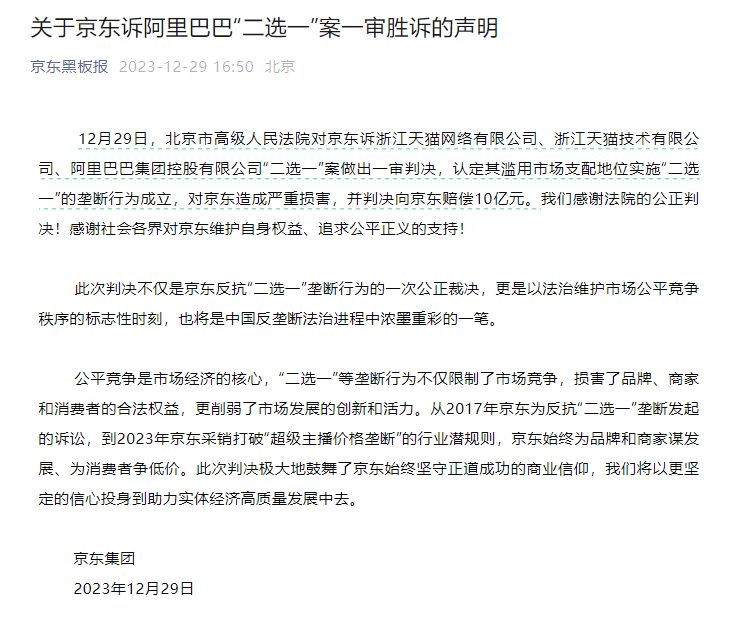 業(yè)內(nèi)認(rèn)為,京東訴阿里巴巴“二選一”案件判決在電商反壟斷領(lǐng)域具有標(biāo)志性意義,給反壟斷法治實(shí)踐帶來(lái)深遠(yuǎn)影響。