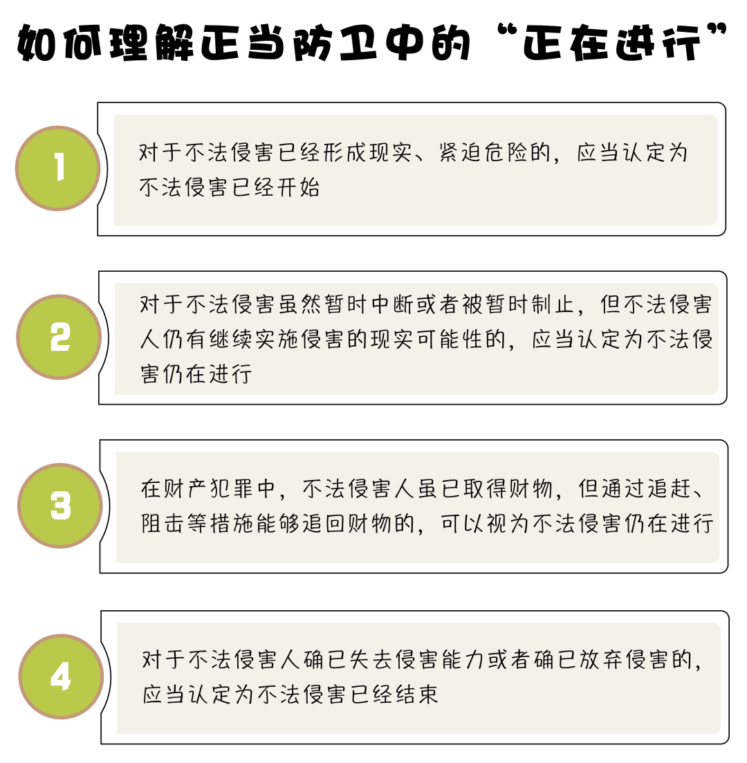 《關于依法適用正當防衛(wèi)制度的指導意見》明確規(guī)定,正當防衛(wèi)必須是針對“正在進行”的不法侵害。