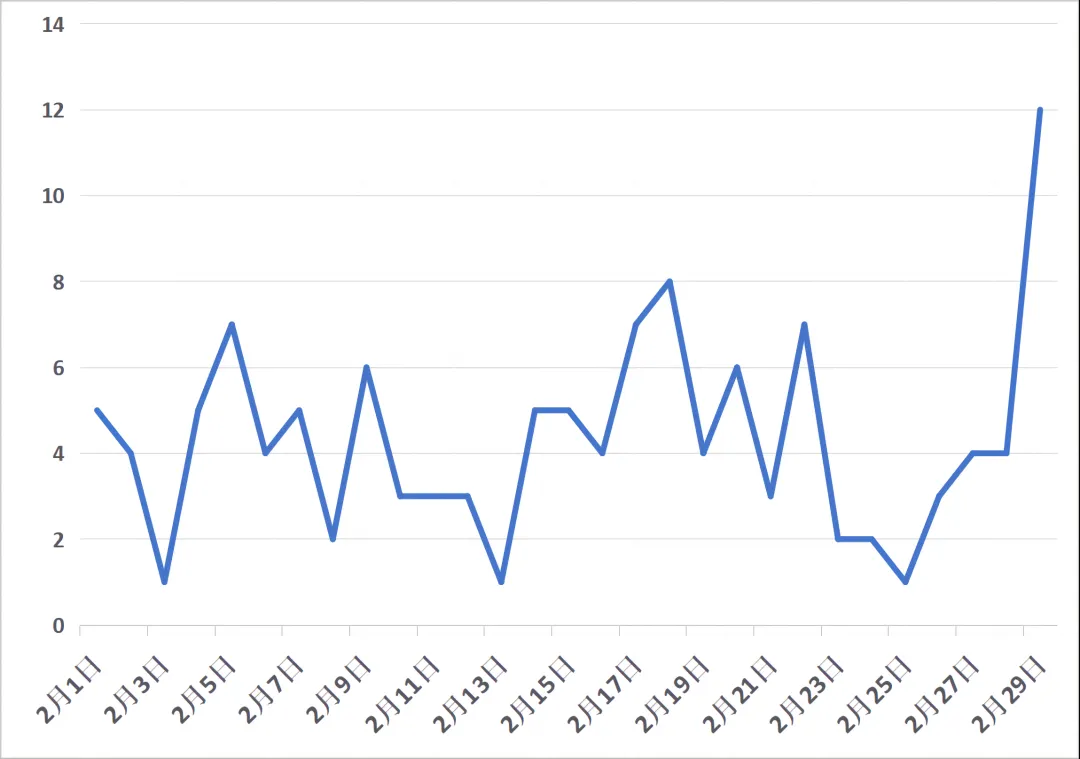 2024年2月,法治網(wǎng)輿情中心共監(jiān)測到熱點事件123起。從類型分布上看,企業(yè)相關(guān)熱點事件最多發(fā),占比約25%;社會新聞次之,占比近19%;突發(fā)事故及案事件總體熱度較高。從時間分布上看,2月29日發(fā)生的熱點事件最多,達12起。熱度最高的事件為“2024年央視春晚”,其次為多部春節(jié)檔電影上映引發(fā)熱議、武漢凍雨、OpenAI推出人工智能視頻生成模型“Sora”等事件。整體上看,2月并未出現(xiàn)高熱度、高烈度的負面輿情事件,輿論場平穩(wěn)有序。
