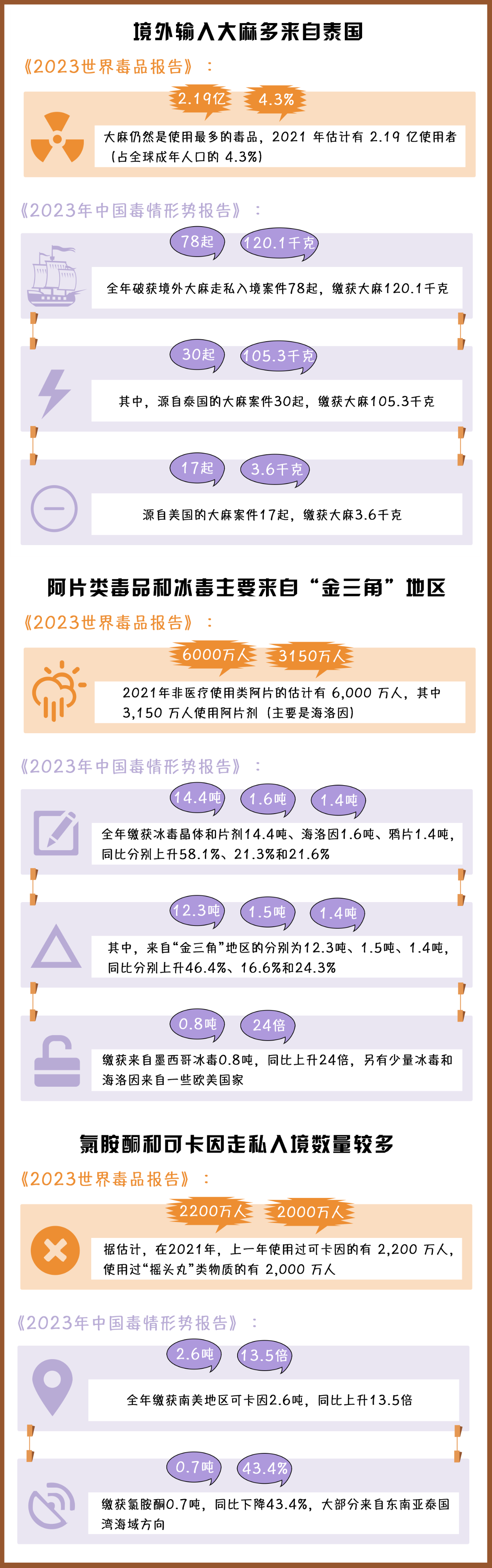 (制作:法治網(wǎng)輿情中心 數(shù)據(jù)來源:《2023年世界毒品報(bào)告》《2023年中國毒情形勢報(bào)告》)