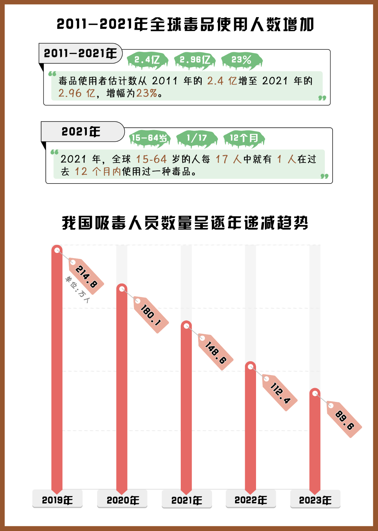 (制作:法治網(wǎng)輿情中心 數(shù)據(jù)來源:《2023年世界毒品報(bào)告》《2019年—2023年中國毒情形勢報(bào)告》)