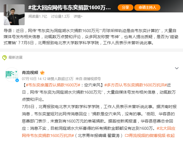 三是捏造救援救助信息。災(zāi)害發(fā)生后,物資調(diào)撥、人員搜救、群眾轉(zhuǎn)移等搶險救援情況被主流媒體持續(xù)報道,吸引輿論廣泛關(guān)注,相關(guān)謠言趁機(jī)流竄,成為傳播主旋律中的雜音。如抖音網(wǎng)民“賓利xx”發(fā)視頻謊稱,河南南陽市臥龍區(qū)陸營鎮(zhèn)王莊村被水淹,臥龍區(qū)使用直升機(jī)進(jìn)行救援。經(jīng)核實,“直升機(jī)救援”一說系虛假信息。網(wǎng)傳“韋東奕(韋神)為洞庭湖水災(zāi)捐款1600萬元”消息引發(fā)關(guān)注,多個相關(guān)視頻獲得數(shù)萬點(diǎn)贊。事后,韋東奕親屬回應(yīng)稱系“假消息”,湖南岳陽市和華容縣慈善部門也表示,未查到有1600萬元的單筆捐款。自媒體這種無底線的“碰瓷式營銷”激起輿論公憤,《新華每日電訊》發(fā)文稱,世上沒有所謂的“正能量謠言”,旗幟鮮明地打擊各類謠言,鏟除造謠傳謠的土壤,才是真正的正能量?!侗本┩韴蟆房脑u論稱,給“韋神”貼金是假,靠造謠撈金是真,任短視頻謠言隔三岔五污染視聽,會對整個社會信任體系造成沖擊。