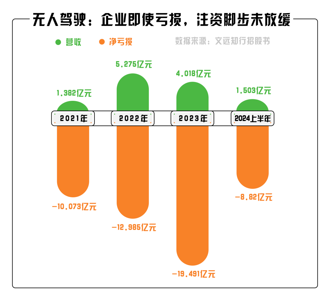 以行業(yè)獨角獸——文遠知行為例,打開文遠知行的官網(wǎng),映入眼簾的“以無人駕駛改變人類出行”的口號格外引人注目。根據(jù)文遠知行招股書的數(shù)據(jù),2021年至2024年上半年,文遠知行實現(xiàn)營收分別為1.382億元、5.275億元、4.018億元、1.503億元,分別凈虧損10.073億元、12.985億元、19.491億元、8.82億元,三年半凈虧損超51億元,依舊沒能阻擋文遠知行前進的腳步,也從側面體現(xiàn)出無人駕駛新一輪“內卷”似乎已經(jīng)來臨。