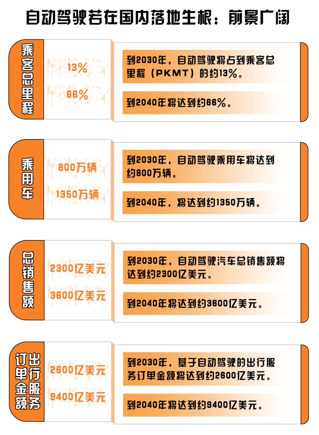 “冰凍三尺非一日之寒,水滴石穿非一日之功”。無人駕駛作為自動駕駛的高級階段,其能夠在國內爆火“出圈”絕非偶然。咨詢公司麥肯錫預計,我國未來很可能成為全球最大的自動駕駛市場,至2030年,自動駕駛相關的新車銷售及出行服務創(chuàng)收將超過5000億美元,自動駕駛市場優(yōu)化擴張,為無人駕駛在國內發(fā)展打下堅實基礎。