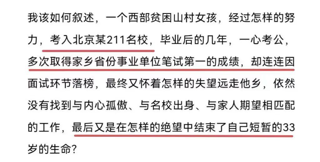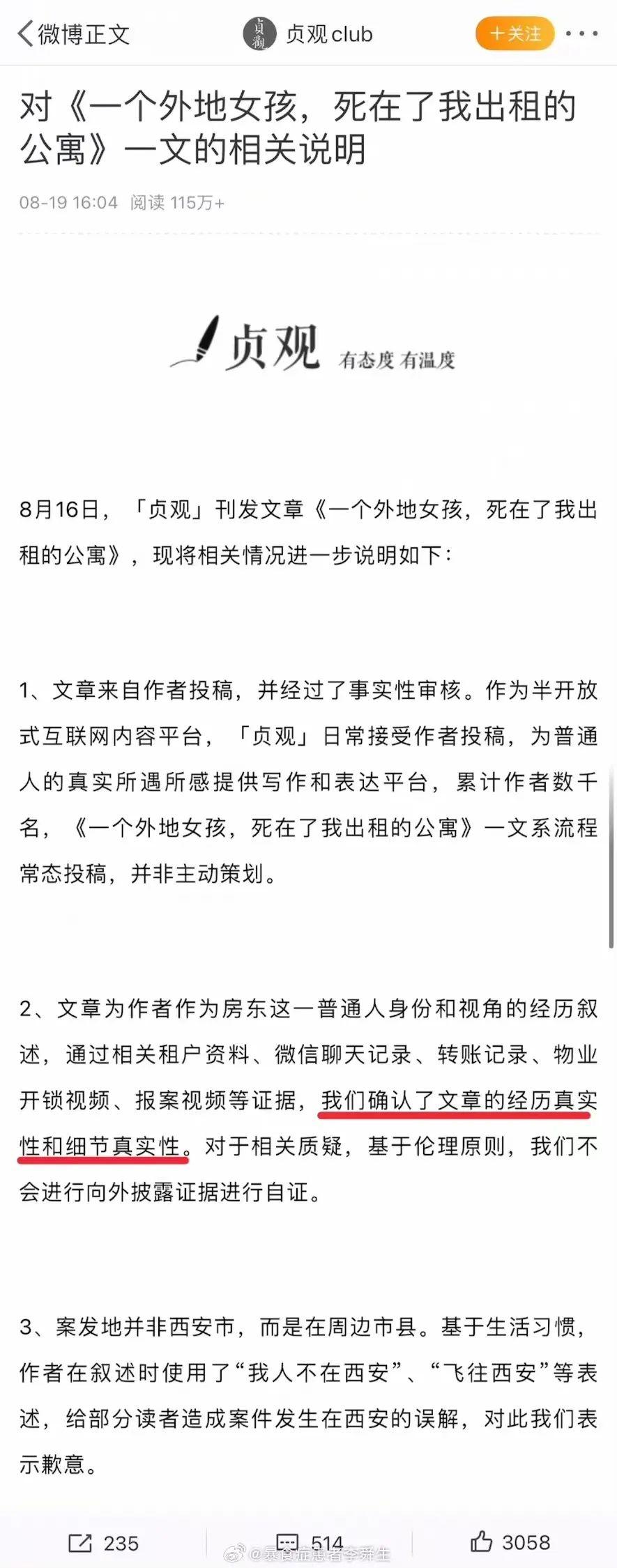 8月16日,微信公眾號(hào)“貞觀”發(fā)布一篇作者為“十二橡樹”的文章《一個(gè)外地女孩死在了我出租的公寓》。文章稱,今年4月,一名來(lái)自寧夏西海固山區(qū)的女孩租住了作者的單身公寓,她畢業(yè)于北京211高校,職業(yè)為會(huì)計(jì),當(dāng)時(shí)正在陜西西安找工作。女孩畢業(yè)后一心考公,多次取得家鄉(xiāng)省份事業(yè)單位筆試第一的成績(jī),卻一次次在面試環(huán)節(jié)落榜。6月25日,有人發(fā)現(xiàn)女孩疑似餓死在出租屋內(nèi),警方已介入處理。8月18日,“貞觀”以保護(hù)當(dāng)事人為由刪除該文章,并回應(yīng)稱文中所述為真實(shí)事件。8月19日,“貞觀”再次回應(yīng)稱文章來(lái)自作者投稿,經(jīng)過(guò)事實(shí)性審核,但案發(fā)地并非西安市,而是在周邊市縣。相關(guān)文章在社交平臺(tái)上引起熱傳,輿論呈現(xiàn)兩極分化:部分網(wǎng)民表示震驚和悲涼,借此對(duì)社會(huì)表達(dá)不滿;部分網(wǎng)民則對(duì)文內(nèi)相關(guān)細(xì)節(jié)的真實(shí)性提出疑問。