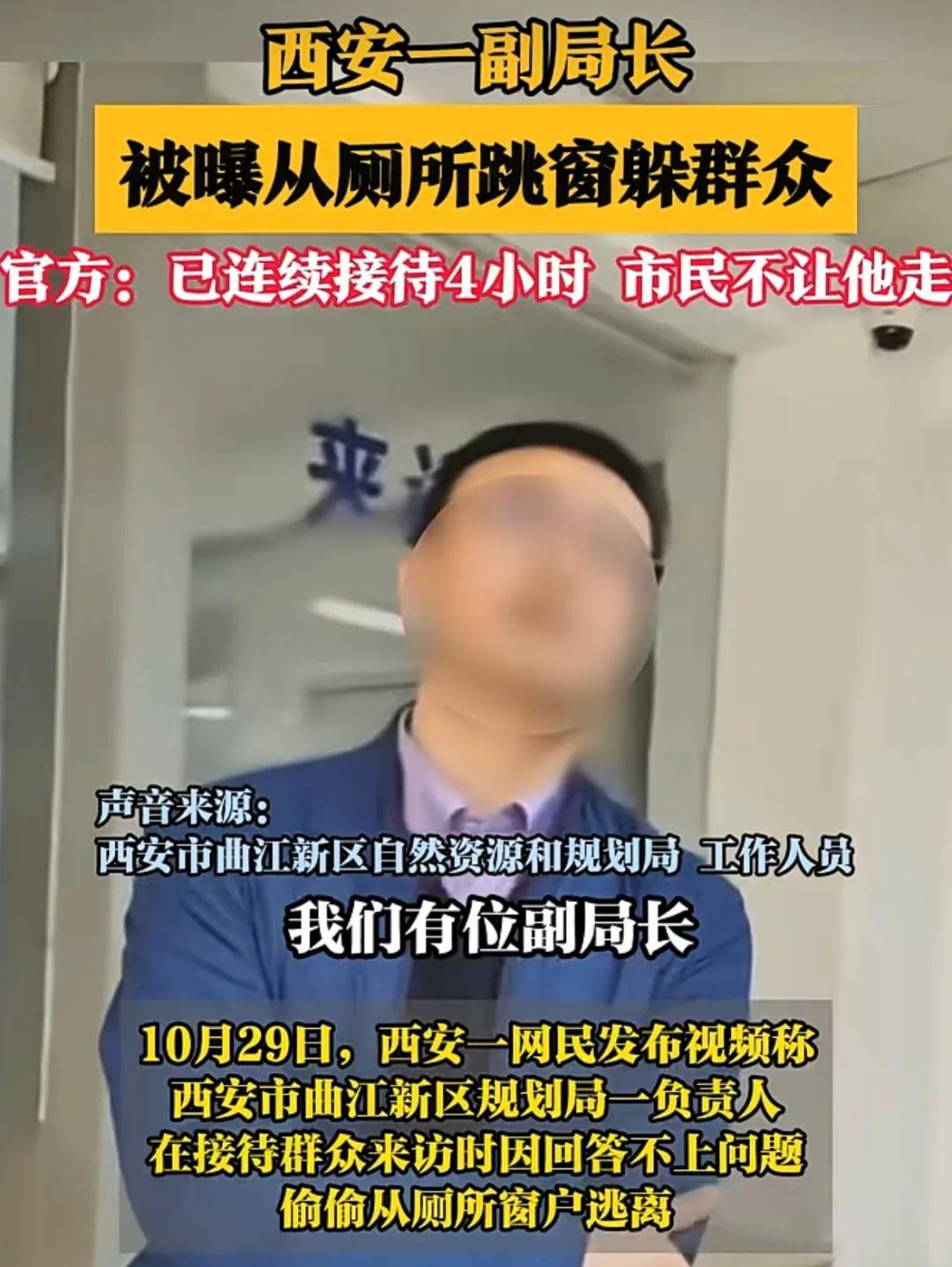 10月28日,一則“官員跳窗逃跑”的視頻在網(wǎng)絡(luò)傳播。視頻顯示,多名群眾將一名身著藍(lán)色上衣的男子圍住,疑似就房屋拆遷問題進(jìn)行爭執(zhí)。圍觀群眾有的拍桌子,有的大聲呼喊,稱“今天不給個(gè)說法,誰也別想離開這里”等,隨后該男子從廁所跳窗逃走。10月29日,大皖新聞、《瀟湘晨報(bào)》等多家媒體報(bào)道此事。據(jù)爆料的西安市民反映,其上訪是因?yàn)樽约杭腋浇诓疬w,當(dāng)?shù)鼐用癜l(fā)現(xiàn)政府部門最新規(guī)劃的地理位置與最初承諾的不一樣,且距離高壓線過近。當(dāng)日下午,西安市曲江新區(qū)自然資源和規(guī)劃局工作人員通過媒體回應(yīng)稱,視頻人物是該局一名副局長,其從九點(diǎn)多到下午一點(diǎn)多一直在接訪,但市民不讓其離開,無奈之下從窗戶離開。針對群眾反映的情況,該局也在研究高壓線設(shè)備的遷移問題,后續(xù)將進(jìn)一步加強(qiáng)與征遷市民的溝通交流,爭取妥善處理。10月30日下午,“@封面新聞”報(bào)道稱,針對工作人員在接訪期間的不當(dāng)行為,曲江新區(qū)黨工委、管委會高度重視,已安排紀(jì)檢監(jiān)察機(jī)關(guān)聯(lián)合相關(guān)部門啟動調(diào)查程序。當(dāng)?shù)毓俜降目焖偬幹糜行Ь徍洼浨?,但事件帶來的討論為公職人員和政府部門應(yīng)對網(wǎng)絡(luò)輿情提供思路和借鑒。