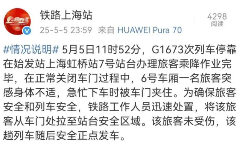 5月5日,網(wǎng)傳上海虹橋高鐵站又現(xiàn)“女子阻礙高鐵關(guān)門(mén)”事件。視頻顯示,有目擊者稱,女子此舉是為了等后面的老太太。當(dāng)日深夜,“@鐵路上海站”通報(bào)稱,當(dāng)事旅客因突感身體不適,急忙下車時(shí)被門(mén)夾住,工作人員迅速將其拉至安全區(qū)域。該旅客未受傷,該趟列車隨后安全正點(diǎn)發(fā)車。通報(bào)發(fā)出后,多數(shù)網(wǎng)民表示理解,但也有網(wǎng)民并不認(rèn)同上海鐵路方的處理方式,認(rèn)為如果以后都可以用這些理由,會(huì)引發(fā)更多人效仿。
