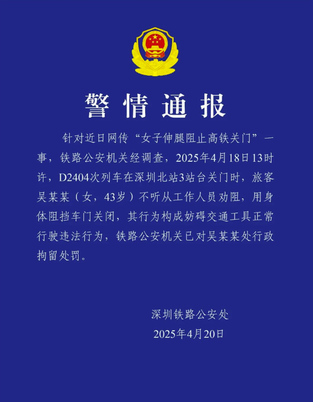 4月18日,一段“女子伸腿阻止高鐵關(guān)門(mén)”的視頻在網(wǎng)絡(luò)上引起熱議。視頻中,一名女性旅客強(qiáng)行用身體阻攔車門(mén),兩名工作人員極力制止卻未能成功,直到三名同行人上車才離開(kāi)車門(mén),隨后列車關(guān)門(mén)駛離。4月19日,“@廣鐵集團(tuán)深圳北火車站”發(fā)布情況說(shuō)明,證實(shí)網(wǎng)傳視頻屬實(shí),并稱未造成列車晚點(diǎn),相關(guān)部門(mén)已介入調(diào)查。輿論要求嚴(yán)懲行為人呼聲較高,部分網(wǎng)民不滿工作人員制止不力,對(duì)相關(guān)法律規(guī)章制度未嚴(yán)格執(zhí)行。4月20日,深圳鐵路公安處官方微博通報(bào)稱,旅客吳某某行為構(gòu)成妨礙交通工具正常行駛違法行為,已被行政拘留。主流輿論點(diǎn)贊警方處置及時(shí),并圍繞“攔門(mén)事件何時(shí)休”展開(kāi)討論。如中國(guó)網(wǎng)發(fā)文建議,修訂《鐵路安全管理?xiàng)l例》,明確阻礙發(fā)車的量化處罰標(biāo)準(zhǔn),如按延誤時(shí)長(zhǎng)階梯式罰款。上觀新聞、紅網(wǎng)發(fā)文稱,鐵路部門(mén)應(yīng)加大處罰力度,將“危害安全行為”納入個(gè)人征信系統(tǒng)、列入限行“黑名單”,形成更強(qiáng)的震懾效應(yīng)。
