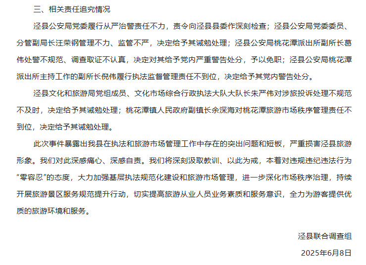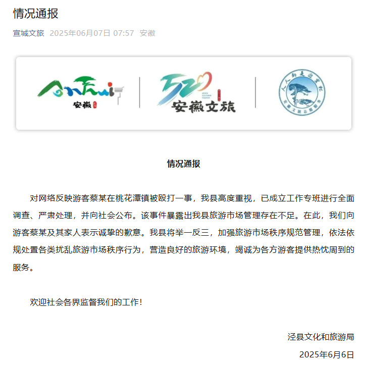 6月7日0時(shí)許,涇縣文化和旅游局發(fā)布情況通報(bào)稱,已成立工作專班進(jìn)行全面調(diào)查,向游客蔡某及其家人致歉。但輿論怒火并未完全平息,不少網(wǎng)民表示不能僅讓文旅部門(mén)“背鍋”,當(dāng)?shù)毓矙C(jī)關(guān)應(yīng)深入調(diào)查、嚴(yán)肅問(wèn)責(zé)。據(jù)微信公眾號(hào)“涇縣人民政府發(fā)布”7日晚消息,涇縣召開(kāi)全縣旅游市場(chǎng)秩序整治工作會(huì)議,會(huì)議要求“聚焦短板弱項(xiàng),抓好旅游市場(chǎng)秩序整治”等。
