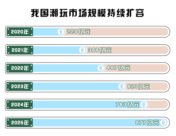 潮玩市場規(guī)模持續(xù)擴張奠定基礎。據(jù)《2025-2030年中國潮流玩具深度分析及發(fā)展前景研究預測報告》數(shù)據(jù)顯示,2020-2024年中國潮流玩具市場規(guī)模已經(jīng)從229億元攀升至763億元,且預計2025年突破877億元。潮玩市場擴容,大批消費者持續(xù)涌入,為培育LABUBU這樣的優(yōu)質(zhì)IP提供了肥沃的土壤。