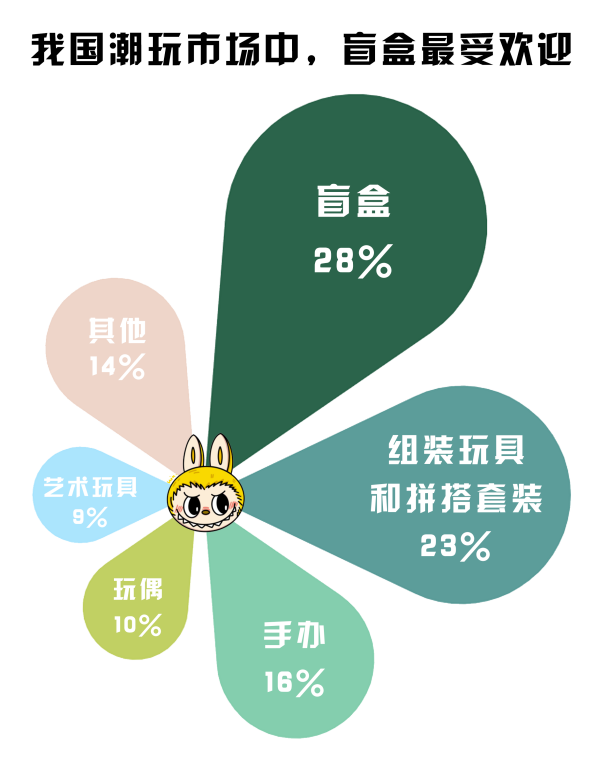 盲盒屬性為消費者提供情緒價值。數(shù)據(jù)顯示,我國潮玩市場中,盲盒是最大的細分市場,占比約28%。