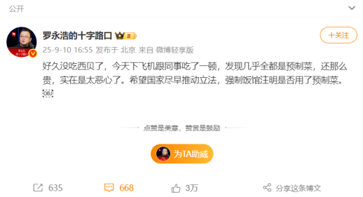 回溯這場討論的源頭,始于羅永浩的一篇微博。9月10日下午,“@羅永浩的十字路口”發(fā)博稱,“好久沒吃西貝了,今天下飛機跟同事吃了一頓發(fā)現(xiàn)幾乎全都是預(yù)制菜,還那么貴,實在是太惡心了。希望國家盡早推動立法,強制飯館注明是否用了預(yù)制菜?!碧陌l(fā)出后迅速引起網(wǎng)民關(guān)注。