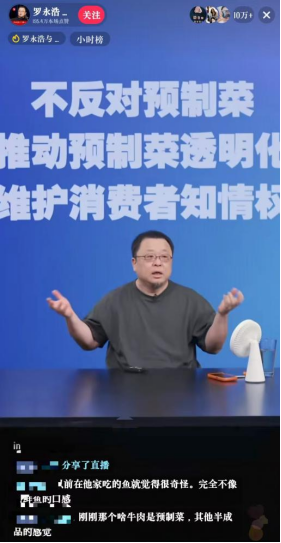 9月12日晚間,羅永浩在多平臺同步直播,開播僅10分鐘其抖音直播間觀看人數(shù)已超10萬。羅永浩在直播中以西貝使用的“凍海鱸魚”舉例,認為食用這種經(jīng)過深度工業(yè)化處理的食材與大眾去餐廳追求新鮮的初衷顯然不符,且稱西貝“是所有賣預(yù)制菜餐廳里賣最貴的”。羅永浩強調(diào),預(yù)制菜還沒有正式的國家標(biāo)準,不反對預(yù)制菜,而是主張“推動中國預(yù)制菜行業(yè)透明化、保障消費者的知情權(quán)”,并點贊了餐飲品牌老鄉(xiāng)雞公示菜品區(qū)分“現(xiàn)做”“半預(yù)制”“預(yù)制”加工等級的舉措。