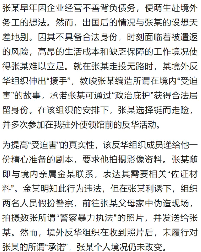 4. “境外反華組織教唆擺拍暴力執(zhí)法” 案。8月14日,國家安全部公布一起標題為《跨境賣慘終成空》的案例。據悉,張某國內企業(yè)經營不善負債,赴境外務工后因無合法身份面臨遣返風險。境外反華組織以“政治庇護換取居留身份”為誘餌,提供詳細拍攝劇本,還提出“畫面暴力血腥”“效果要慘”“抓拍增強真實感”等要求。在反華組織教唆下,張某聯(lián)系到親屬金某,金某明知此行為違法,但在張某利誘下組織兩名人員假扮警察,前往張某父母家中偽造現(xiàn)場,拍攝數(shù)張所謂“警察暴力執(zhí)法”的照片,并將材料發(fā)送境外,但境外反華組織在收到照片后未履行對張某的所謂“承諾”。該案最終被國家安全機關破獲。央視網、微信公眾號“俠客島”等轉發(fā)相關內容。輿論將此案稱為一場“政治避難”鬧劇,指出“因一己之利參加境外反華活動,為反華勢力提供煽宣‘彈藥’,但最終竹籃打水一場空”。