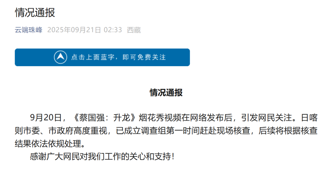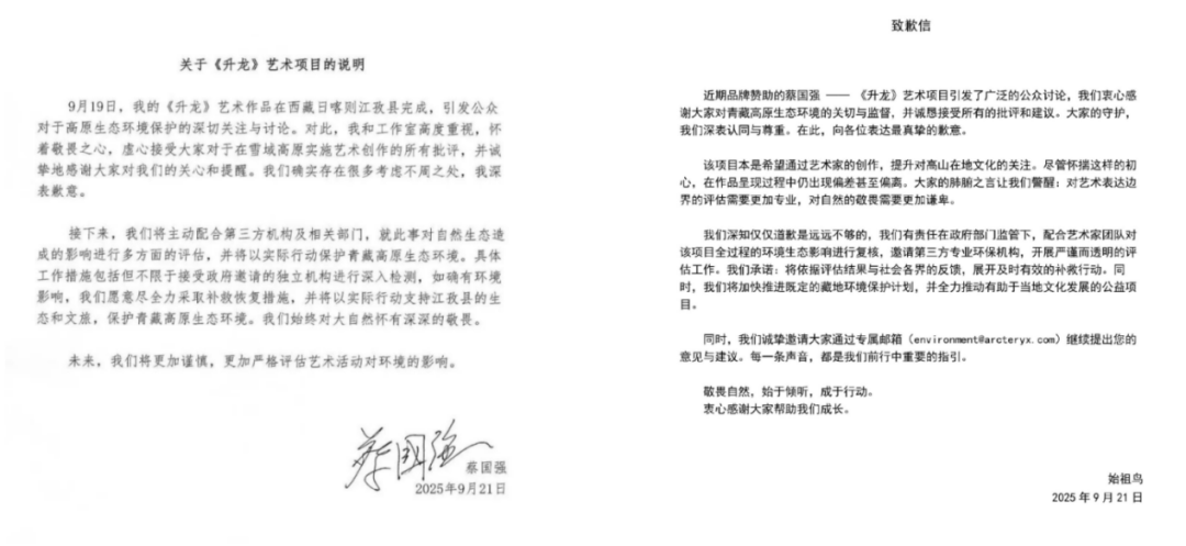 21日凌晨,日喀則市互聯(lián)網(wǎng)信息辦公室發(fā)布情況通報稱,日喀則市委、市政府已成立調(diào)查組第一時間趕赴現(xiàn)場核查,后續(xù)將根據(jù)核查結(jié)果依法依規(guī)處理。當(dāng)日,蔡國強工作室、始祖鳥分別發(fā)布致歉說明,蔡國強表示將“盡全力采取補救恢復(fù)措施”,始祖鳥則稱將邀第三方評估并依結(jié)果補救,同時推進(jìn)藏地環(huán)保計劃與文化公益項目。