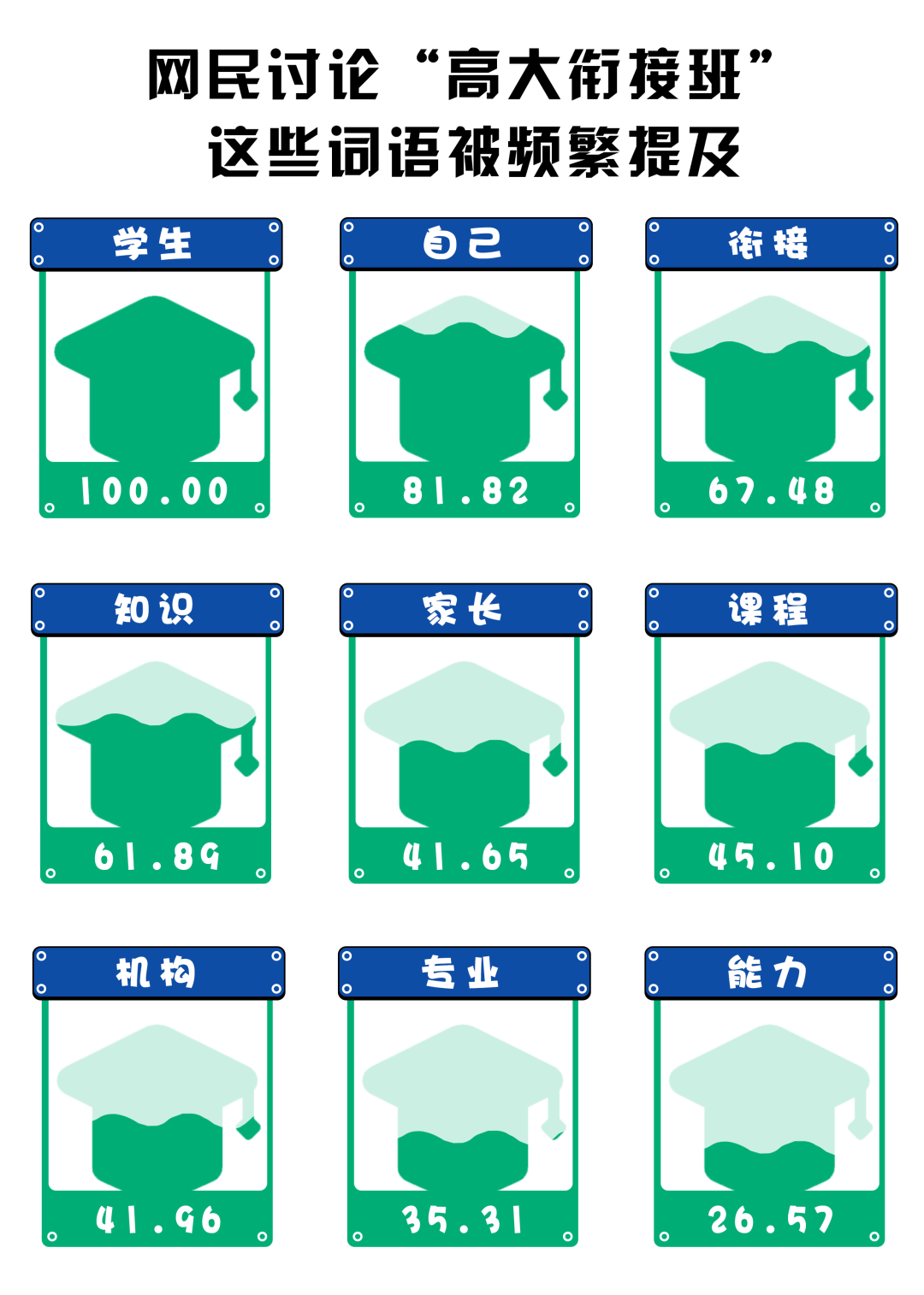 (數據來源:選取知乎話題“培訓機構推出‘高大銜接班’,為大一新生補習大學知識,暑假補課真能‘贏在大學起跑線’嗎?”下的172個回答,做分詞及歸一化處理,進行分詞后將熱度最高的詞語規(guī)定為100)