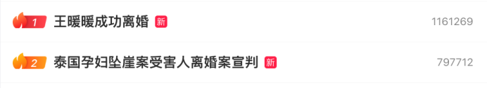 截至10月12日20時,全網(wǎng)信息總量12萬余條,“#王暖暖獲離婚賠償50萬#”“#泰國孕婦墜崖案受害人離婚案宣判#”“#王暖暖成功離婚#”等全平臺相關(guān)話題閱讀量累計(jì)14.6億次。
