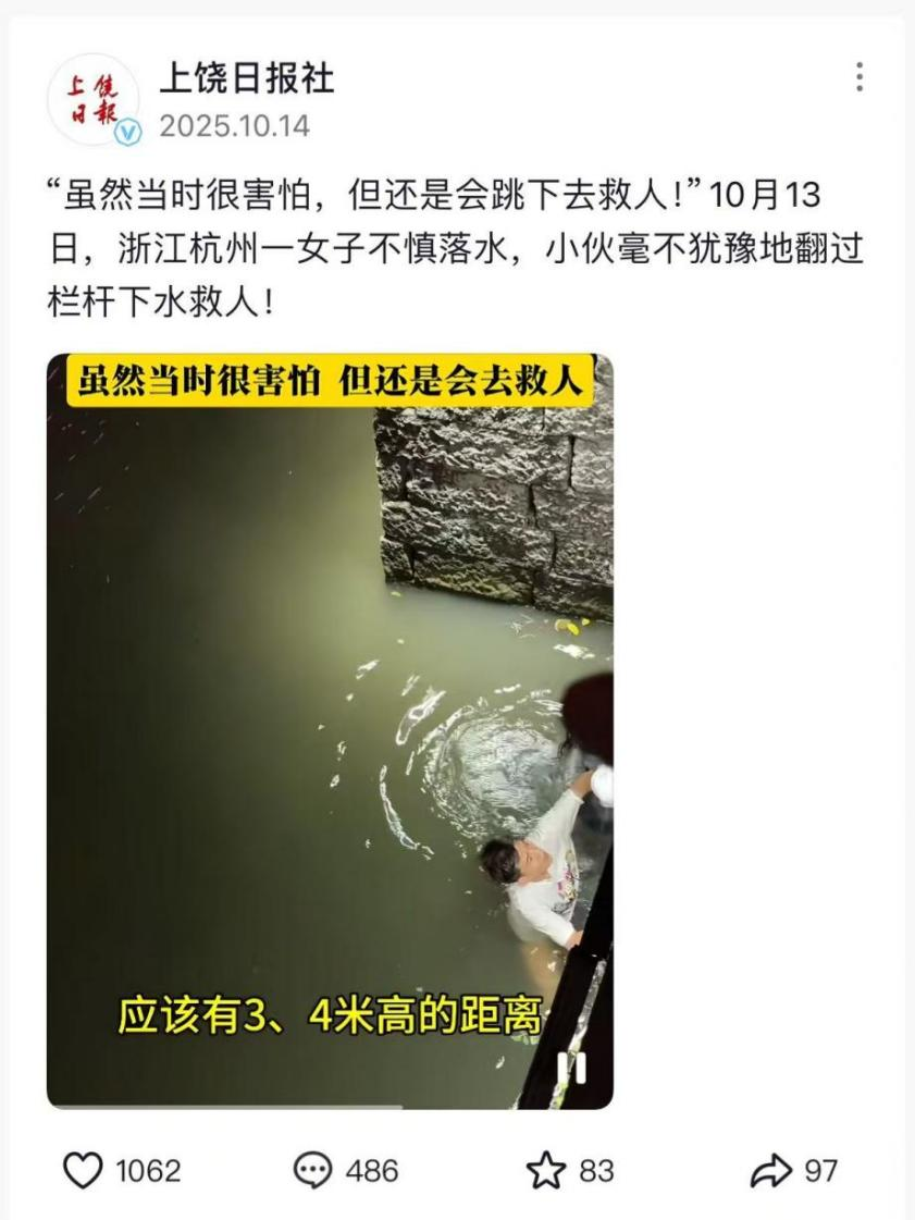 10月14日,“上饒日?qǐng)?bào)社”抖音賬號(hào)報(bào)道稱(chēng),10月13日,浙江杭州一女子不慎落水,小伙毫不猶豫地翻過(guò)欄桿下水救人,并配發(fā)救人視頻。該視頻引起部分網(wǎng)民關(guān)注,多數(shù)網(wǎng)民為男子救人行為點(diǎn)贊。