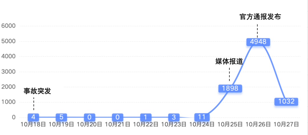 自10月18日起,少量網(wǎng)民發(fā)布事故信息引發(fā)關(guān)注,25日媒體介入報道推動輿情熱度快速攀升,官方發(fā)布通報后輿情信息量觸達頂峰。截至10月28日10時,相關(guān)信息8061條,相關(guān)微博話題閱讀量累計達1.15億。