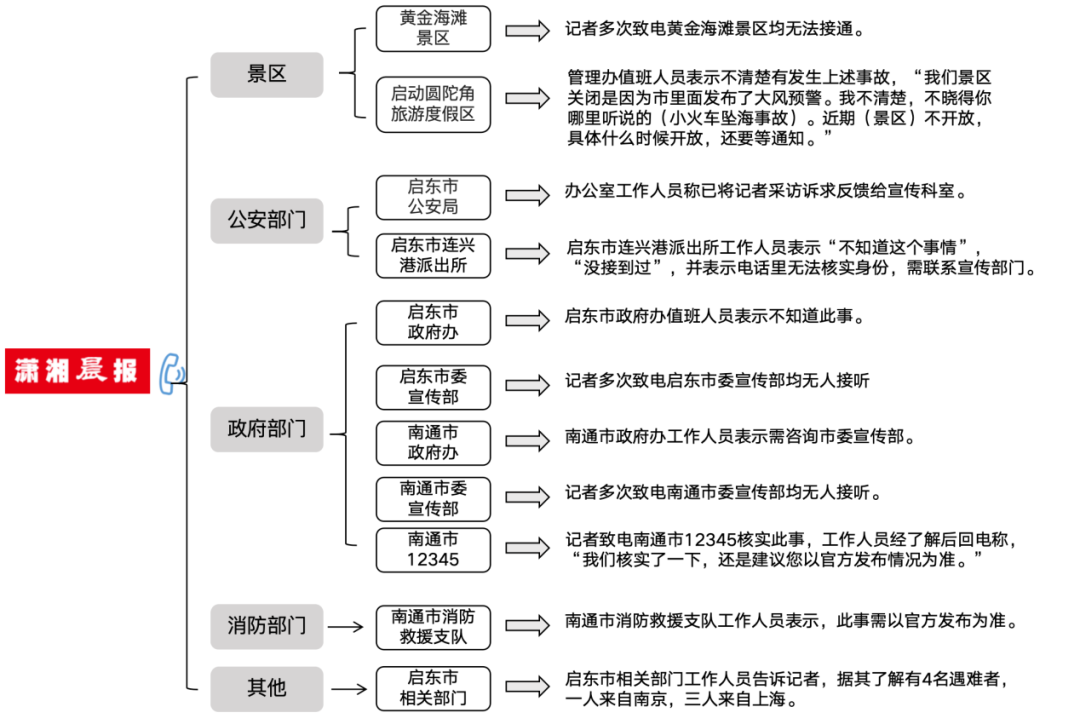 10月25日13時許,瀟湘晨報報道稱,江蘇一海灘景區(qū)觀光小火車疑發(fā)生事故致多人傷亡。記者向景區(qū)及市縣十余個部門致電,但回應(yīng)均為“不清楚”“不知道此事”“等官方發(fā)布通知”“聯(lián)系宣傳部門”(回復情況見下圖)。啟東市相關(guān)部門工作人員表示,據(jù)其了解有4名遇難者,一人來自南京,三人來自上海。