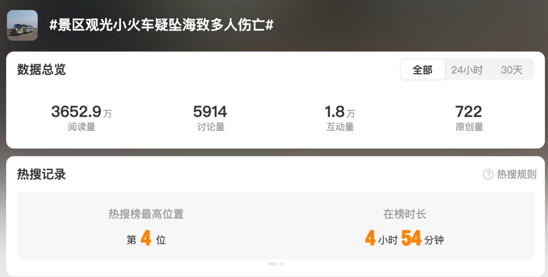 隨后,紅星新聞、極目新聞、上游新聞等媒體跟蹤報道,進一步還原事故發(fā)生情況、傷亡情況及善后工作。如紅星新聞采訪知情人報道稱,乘坐小火車的都是景區(qū)的散客,小火車開到海邊的一個大門處時被攔住了,有工作人員提到有預警,這個游覽項目不開放,“可能是做了工作,又讓他們?nèi)チ恕薄T谡麄€行程快結(jié)束的時候,有一段路是沒有防浪的坡道,浪把游客打到海里。有的游客抓住相對穩(wěn)固的東西防止自己被風浪卷走,但仍等了約2個半小時才獲救。當日,微博話題“#景區(qū)觀光小火車疑墜海致多人傷亡#”“#多方回應(yīng)觀光火車疑墜海多人傷亡#”“#游客稱小火車出發(fā)前曾被攔后放行#” 登上熱搜榜。多數(shù)網(wǎng)民對事故造成人員傷亡感到痛心;部分網(wǎng)民不滿信息公布不及時、不透明,質(zhì)疑相關(guān)部門回應(yīng)“一問三不知”“踢皮球”;部分網(wǎng)民希望相關(guān)部門盡快發(fā)布詳細通報。