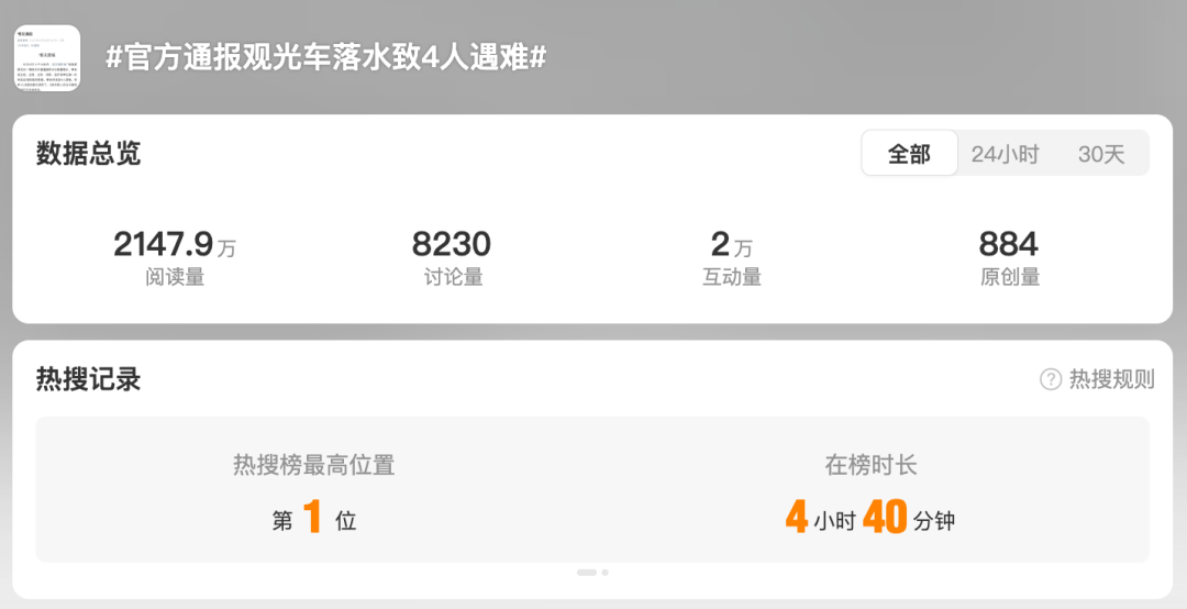 央視新聞、九派新聞、紅星新聞等媒體轉(zhuǎn)發(fā)通報內(nèi)容,微博話題“#江蘇啟東觀光車事故4人遇難#”“#江蘇觀光車落水相關(guān)責任人已被控制#”“#觀光車落水的度假區(qū)剛完成安全檢查#” 再次登上熱搜榜。