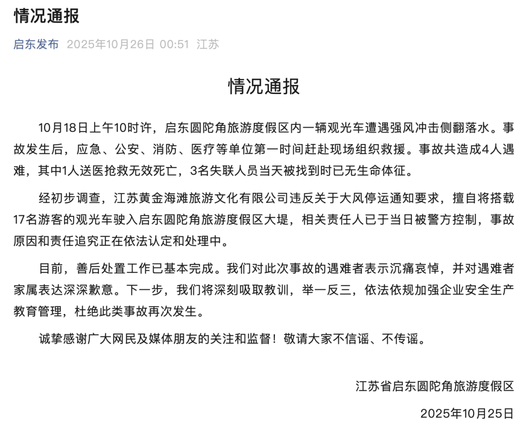 10月26日凌晨,啟東市委宣傳部官方公眾號“啟東發(fā)布”通報稱:10月18日上午10時許,啟東圓陀角旅游度假區(qū)內(nèi)一輛觀光車遭遇強風沖擊側(cè)翻落水。事故發(fā)生后,應(yīng)急、公安、消防、醫(yī)療等單位第一時間趕赴現(xiàn)場組織救援。事故共造成4人遇難,其中1人送醫(yī)搶救無效死亡,3名失聯(lián)人員當天被找到時已無生命體征。經(jīng)初步調(diào)查,江蘇黃金海灘旅游文化有限公司違反關(guān)于大風停運通知要求,擅自將搭載17名游客的觀光車駛?cè)雴|圓陀角旅游度假區(qū)大堤,相關(guān)責任人已于當日被警方控制,事故原因和責任追究正在依法認定和處理中。目前,善后處置工作已基本完成。