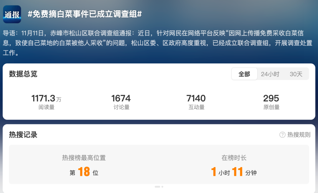 11月11日,赤峰市松山區(qū)聯(lián)合調(diào)查組發(fā)布情況通報稱,針對網(wǎng)民在網(wǎng)絡(luò)平臺反映“因網(wǎng)上傳播免費采收白菜信息,致使自己菜地的白菜被他人采收”的問題,松山區(qū)委、區(qū)政府高度重視,已經(jīng)成立聯(lián)合調(diào)查組,開展調(diào)查處置工作。后續(xù)情況將及時向社會發(fā)布。微博話題“#免費摘白菜事件已成立調(diào)查組#”“#官方通報白菜免費摘事件#”再次登上熱搜榜,輿論肯定官方積極介入調(diào)查,并對最終調(diào)查結(jié)果表示關(guān)注。