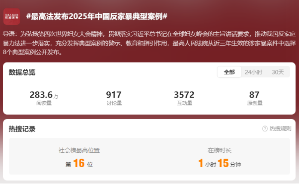 截至11月21日14時,全網(wǎng)相關(guān)信息1.1萬余條?!?最高法發(fā)布2025年中國反家暴典型案例#”“#自殘威脅也是家庭暴力#”等微博話題閱讀量累計超5201.3萬。