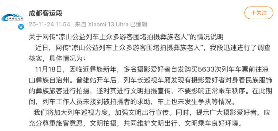 11月24日12時(shí)許,“@成都客運(yùn)段”發(fā)布情況說(shuō)明稱,因臨近彝族新年,近日多名攝影愛(ài)好者乘坐5633次列車前往涼山彝族自治州。普雄站開(kāi)車后,列車長(zhǎng)巡視車廂發(fā)現(xiàn)有攝影愛(ài)好者對(duì)身著民族服飾的彝族旅客進(jìn)行拍攝,遂對(duì)其進(jìn)行文明拍攝宣傳,不要影響正常乘車秩序。在此期間,列車工作人員未接到被拍攝者的求助,車上也未發(fā)生爭(zhēng)執(zhí)等情況。今后將加大列車巡視力度,加強(qiáng)文明出行宣傳。