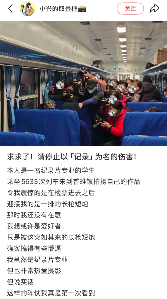 11月19日20時(shí)許,小紅書(shū)網(wǎng)民“@小興的取景框”發(fā)帖稱,自己在乘坐5633次列車前往普雄鎮(zhèn)的途中,在車廂內(nèi)遇到一攝影團(tuán)手持“長(zhǎng)槍短炮”不停走動(dòng),并不顧被拍攝者意愿圍著一個(gè)人拍攝,呼吁停止以“記錄”為名的傷害,不少網(wǎng)民留言認(rèn)為這是冒犯被拍攝者的“鏡頭霸凌”行為。