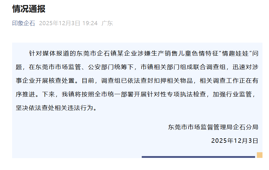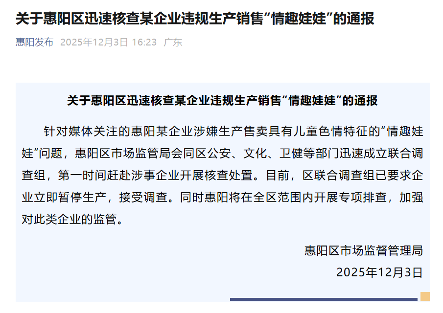 12月3日上午,廣東惠州惠陽區(qū)市場監(jiān)督管理局一名工作人員表示,針對報道披露的事件,惠陽區(qū)相關(guān)領(lǐng)導(dǎo)高度重視,已召集多部門進(jìn)行聯(lián)合研判。3日下午,惠陽區(qū)市場監(jiān)督管理局發(fā)布情況通報,已會同區(qū)公安、文化、衛(wèi)健等部門迅速成立聯(lián)合調(diào)查組,要求企業(yè)立即暫停生產(chǎn),接受調(diào)查,同時將在全區(qū)范圍內(nèi)開展專項排查。3日下午,上海市奉賢區(qū)市場監(jiān)督管理局一名工作人員表示,針對此事,正在調(diào)查中。3日晚間,東莞市市場監(jiān)督管理局企石分局通報稱,在東莞市市場監(jiān)管、公安部門統(tǒng)籌下,市鎮(zhèn)相關(guān)部門組成聯(lián)合調(diào)查組,目前已依法查封扣押相關(guān)物品,接下來將按照全市統(tǒng)一部署開展針對性專項執(zhí)法檢查。