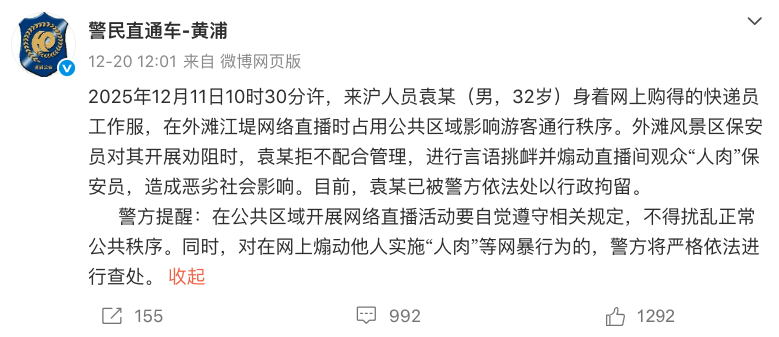 12月20日,上海市公安局黃浦分局官方微博“@警民直通車-黃浦”發(fā)布警方通報稱,2025年12月11日10時30分許,來滬人員袁某(男,32歲)身著網(wǎng)上購得的快遞員工作服,在外灘江堤網(wǎng)絡(luò)直播時占用公共區(qū)域影響游客通行秩序。外灘風(fēng)景區(qū)保安員對其開展勸阻時,袁某拒不配合管理,進(jìn)行言語挑釁并煽動直播間觀眾“人肉”保安員,造成惡劣社會影響。目前,袁某已被警方依法處以行政拘留。