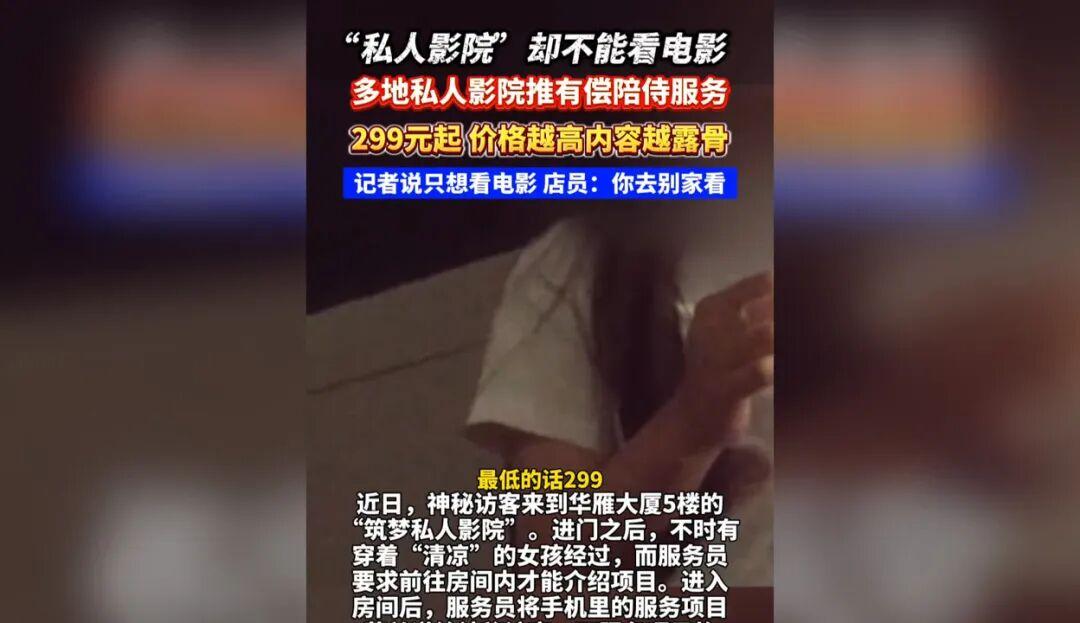 12月19日,江蘇廣電總臺荔枝新聞中心《神秘訪客》發(fā)布暗訪報道,揭露西安、成都、三亞等多地私人影院出現(xiàn)有償陪侍等違規(guī)服務(wù)。其中,西安“筑夢私人影院”強制顧客選購陪侍套餐,相關(guān)項目名稱露骨;成都“云水謠私人影院”地址虛假,隱蔽提供有償陪侍及“擦邊”游戲服務(wù);三亞貝貝私影俱樂部的簡介中,詳細列明了各種服務(wù)以及對應(yīng)的報價,價格越高,內(nèi)容越露骨。