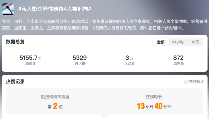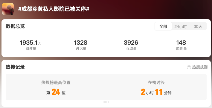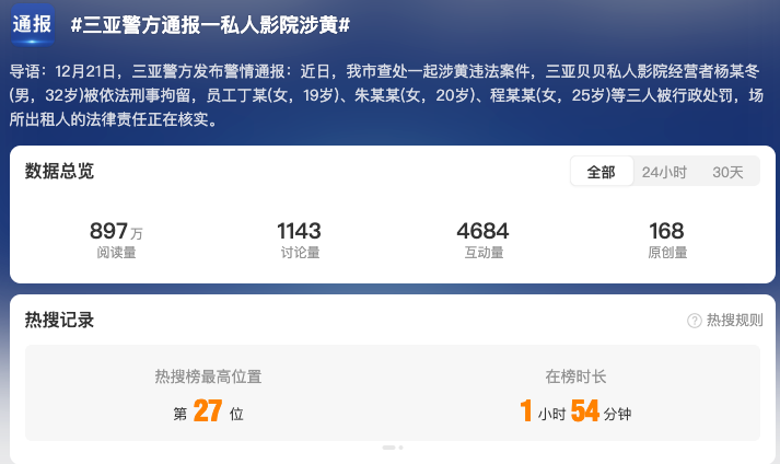 截至12月24日17時,全網(wǎng)相關(guān)信息2.7萬余條。“#私人影院強制要求顧客選擇異性陪侍套餐#”“#私人影院異性陪侍4人被刑拘#”“#成都涉黃私人影院已被關(guān)停#”“#涉黃私人影院3名00后女員工被罰#” 等微博話題閱讀量累計超1.6億。